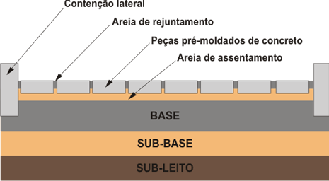 Pavimento flexível cuja estrutura é composta por uma camada de base (ou base e subbase), seguida por camada de revestimento constituída de peças de concreto sobrepostas em uma camada de assentamento e cujas juntas entre as peças são preenchidas por material de rejuntamento e o intertravamento do sistema é proporcionado pela contenção.